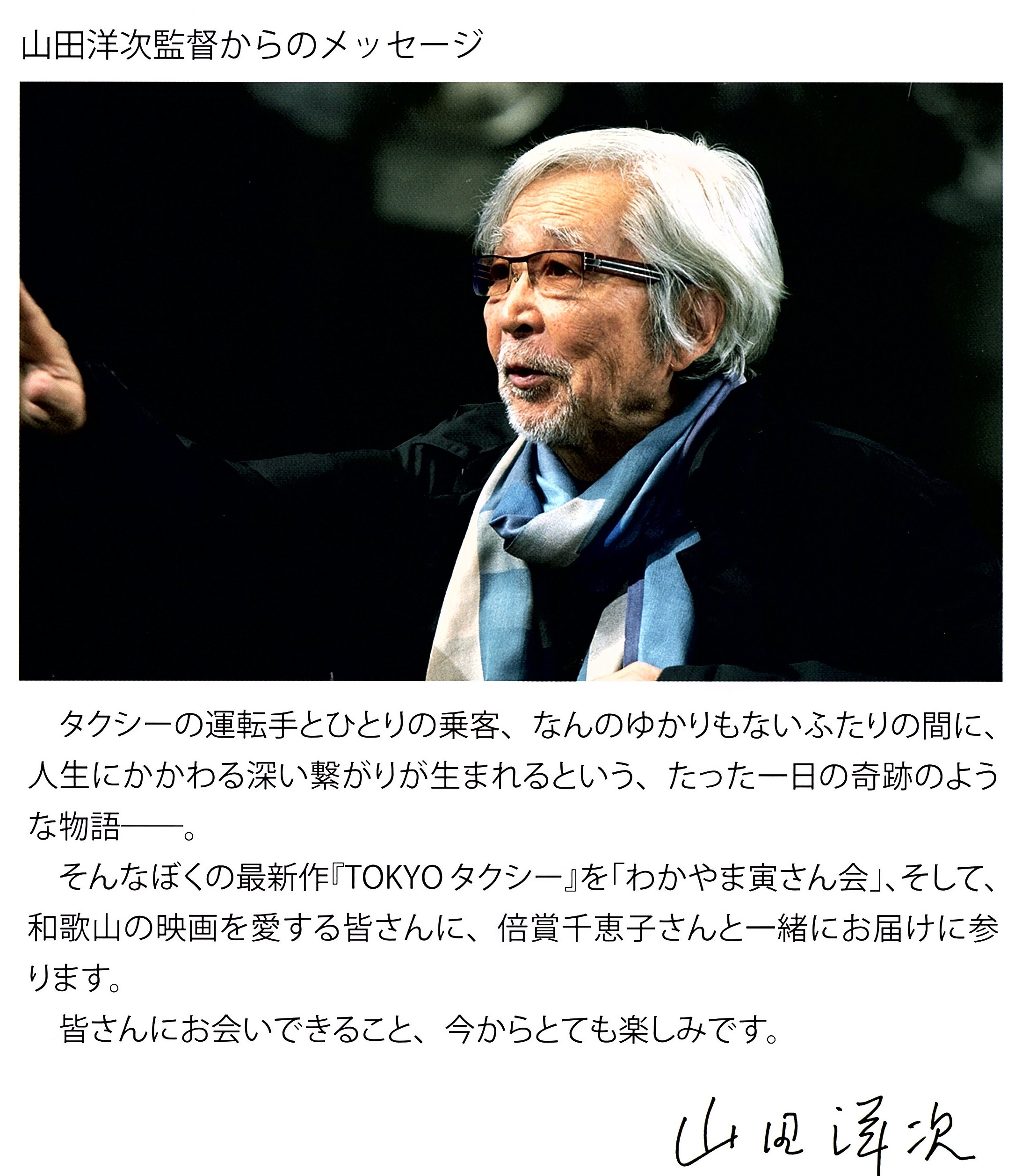 2021年7月5日 第2回 和歌山特別先行上映会 【上映作品】 松竹映画100周年記念作品 映画 『キネマの神様』 【会 場】 ジストシネマ和歌山 一回目 : 開場13:20 上映14:00~ 上映後舞台挨拶 山田洋次監督 土山正人(照明担当) 〈入 れ 替 え〉 二回目 : 開場16:40 上映:17:45 上映前舞台挨拶 山田洋次監督 土山正人(照明担当) 〈ちんどん通信社による来場者歓迎のちんどんパフオーマンス〉 【主 催】 わかやま寅さん会 【協 力】 松竹 ジストシネマ和歌山 麦の郷印刷 (株)山ノ木 太田書店 「本」屋プラグ 広告協賛店舗数102 - 監督メッセージ - 和歌山の映画を愛する皆さんへ ぼくの最新作『キネマの神様』を、お届けします。コロナのせいで映画の観客が減少する、というようなことがあっては困ります。皆さん、日本の映画を応援してください。 7月 山田洋次 今回はコロナ禍が収束しない中での開催となりました。当初4月の上映会になっていましたが、7月に延期となったものです。この間、感染状況を逐次みながら、同時に関係機関のアドバイスを求めての開催準備となりました。劇場での感染例は今まで無い、との情報を受けながらも、当初は座席数を半分で開催する事もやむなしと思われましたが、7月に近づくにつれ和歌山での感染者数は減少に向かい、当日は最前列を空席にする事で開催することができました。もちろん、来場者にはあらかじめ感染対策の徹底を求めた事は当然のことです。 - 後日届いた感想文から - ・「素晴らしい上映会を企画・実現していただき有難うございました…コロナ禍において、製作・撮影等で大変ご苦労されたことも伺えました。元々この上映会も4月に予定されていたとのこと、開催できるかどうかもわからない中で準備を進め、そして無事実現させたわかやま寅さん会の皆さんへお礼を言いたいです。広いスクリーン会場を埋めつくす人・人・人・「こんな満席の映画館久しぶり」と隣の席の会話がきこえてきました。座席いっぱいの観客と一緒に笑って、泣いて…を共有できるのはやっぱりいいなあ。最高の娯楽、最高のぜいたくだと感じました本当に、本当に楽しい2時間でした」。「期待以上の作品をいっぱいの観客の中でみる久しぶりの感動でした」 ・「カットとカットの間に神様が宿る」は黒澤監督言葉だったのですね。東京は緊急事態再発令そしてオリンピック開幕、うまく表現できないフアン・不満の中ですが、最強の心のワクチン『キネマの神様』」でした。・「ゴウが志村けんさんだったら、どんなだったろうと、時々考えながら観てしまいました」 ・「主人公の挫折感、長女の雇止め、孫のひきこもり、妻の人生の選択 に加え、最賃、労働組合、社会情勢を、さりげなく映し、物語は進みました。社会の規格にはまらない主人公を孫は認め、社会にも認められていきます。家族のありようを考えさせられました」。・「拝啓 キネマの神様…昨年はじめクランクインの報を聞き、映画愛に溢れたあなたを広島が誇る街中(なか)の八丁座で観るのを楽しみにしていましたのですが…コロナ禍、そして志村けんさんの訃報に大きなショックを受けました。私自身も職場が閉鎖になり、慣れない仕事と和歌山への転勤となったのは昨年の夏でした。広島にいた時は、沢山映画を観ていましたが・・ですが、和歌山には映画の神様がいました。SNSで見つけた、あなたの特別先行上映会の呟きに飛びつきました。わかやま寅さん会には感謝しかありません」。・「あの山田監督が和歌山に来て下さる!すごい!!と、改めて、わかやま寅さん会の熱意が伝わり、感激しました。…山田監督も土山さんも、とても素敵で夢のようなひとときでした。こんな機会を与えてくださって感謝です」 ・「山田監督、土山さんにもお会い出来、演技派の方たちの演技を見させて頂きありがとうございました。これを機に映画館に足をはこびたいと思っています」 ・「土山さんの照明ですが、光をあてているという感じはなく、自然な感じで効果をあげているのだと思いました」 ・「山田監督の視覚障害の方とのやりとりでは、まだまだ学ばれようとする姿勢に心打たれました」 |