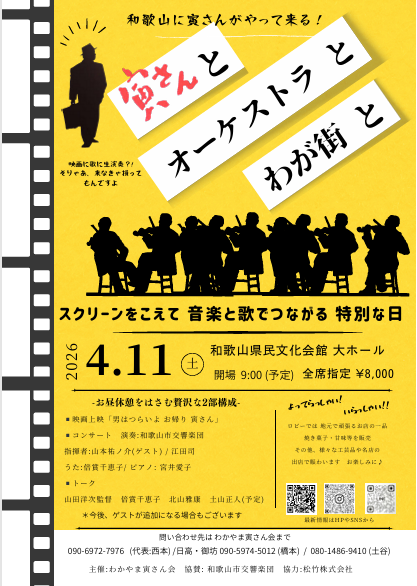 | わかやま寅さん会 は、活気をなくし、「シャッター街]化している街の復活を願って活動しています。長らくお世話になってまいりました山田洋次監督の、「50年かけてつくった1本の長い映画」、『男はつらいよ』等を上映し、街を考えるきっかけにしたいと思っております。「会」が発足して10年、さらに活動を広げたくホームページを設けました。どうぞよろしくお願いいたします。 |