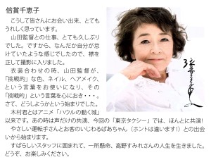 わかやま寅さん会映画まつり (第3回) 【上映作品】 午前の部 開場9:30 上映10:40 映画 『遥かなる山の呼び声』1980年) 上映後舞台トークショー 13:00 倍賞千恵子さん 北山雅康さん 土山正人さん 〈入 れ 替 え〉 午後の部 開場 13:50 上映前舞台トークショー 14:20 倍賞千恵子さん 北山雅康さん 土山正人さん 上映 15:05 映画『男はつらいよ 寅次郎物語』 〈ちんどん通信社による 来場者歓迎のちんどんパフオーマンス〉 【会 場】 ジストシネマ和歌山 【主 催】 わかやま寅さん会 【協 力】 松竹 ジストシネマ和歌山 麦の郷印刷 (株)山ノ木 太田書店 「本」屋プラグ (総合司会)県立星林高校放送専門部の皆さん 広告協賛店舗数120 - 倍賞千恵子さんからのメッセージ - 「わかやま寅さん会」の皆さん初めまして倍賞千恵子です。 今回、私も大好きな映画「遥かなる山の呼び声」を上映して下さるとの事・・・。 私も先日改めてこの映画を見て、自分が出演しているのに、笑ったり、泣いたり、そして、とても懐かしく・・・感動いたしました。私は「男はつらいよ」と言う映画で社会と世間、人間のすばらしさ、本当に沢山の事を学ばせていただきました。私にとっての人生の学校です。本当に映画って素晴らしいですネ。映画を愛している皆さんにお会いできるのを楽しみにしております。お招きいただきありがとうございます。 -北山雅康さんからのメッセージ - 和歌山の皆様、今回は私三平を寅さん会にお招き頂きまして、本当にありがとうございます。和歌山と言えば京都で育った私には、家族で訪れた思い出の地でございます。そこで開かれる”わかやま寅さん会”へ倍賞さんとご一緒に伺わせて頂き、撮影当時のお話をさせて頂ける事を、心より楽しみにしております。そして、なんとこちらの主催をされている西本さんのお名前が三平さん!とても御縁を感じております。皆様☆お邪魔致しまーす。 - 主催者挨拶から - このたびスペシャルゲスト、倍賞千恵子さん、北山雅康さん(シリーズ「くるまや」の店員「三平ちゃん」で出演)に加え、土山正人さん(照明技師-和歌山市出身-)をお迎えして、2本の映画(上記作品)を上映いたします。午前の作品は1980年公開「民子三部作」の3作目、北の大地で酪農に生きる母子の前に現れた、過去のある男との心揺さぶる珠玉の映画です。午後の作品は、シリーズ39作『男はつらいよ 寅次郎物語』、寅さんが少年秀吉君を連れて和歌山へ母をさがしにやってきます。当時(87年)の懐かしい風景も登場します。また満男(さくらたちの息子)が、寅おじさんを通して少年から大人へと成長して行こうとする重要な描写も見逃せません。さて、今回どんな”とっておき”のお話が披露されるのでしょうか…。 当日の舞台では、倍賞さんはシリーズ第一作目の台本を手にした際、「いろんな人たちがいる街に住んでみたい」と感じたという。エキストラ一人一人の動きにまで細かく心を配って画面に命を吹き込む山田監督の撮影現場のエピソードを披露されました。土山さん(37作目(「幸福の青い鳥」)から参加)は、今回上映の『寅次郎物語』の撮影スタッフとして故郷和歌浦での現場に立っていたことを丁寧に振り返りました。司会を務められた北山さんの軽妙な進行で会場との交流も進み、そしてなんと、なんと、ついに名歌手倍賞千恵子さん、「さくらのバラード」をアカペラで披露、会場は拍手喝采に包まれました。 - 後日届いた感想文から - ・「アカペラで歌ってくれるとは夢のようでした」 ・「お声は心に沁みわたりました」 ・「語るような歌声を聞かせていただき感激」 ・「名女優にして名歌手!」 映画については・・・「日本映画で一番好きな映画(遥かなる山の呼び声)」 ・「シナリオ、映像、演技…どれをとっても最高の作品…倍賞さんが、しばらく民子から抜けなかった、という言葉が心に残っています。また、倍賞さんの牧場での作業の大変さと手際のよさにびっくり、後(今回)のお話しですごく練習というか努力されたんだと感動しました」 ・「寅さんの永遠のマドンナにふさわしい方だなあとしみじみ思いました」 劇場上映については、・・・「少年時代を思い出すような満席の映画館内で共に笑い涙し、終わりには観客同志で拍手する…テレビで観ていつも感動していましたが、スクリーンで観る事ができて感動が何倍にも膨らみました」 ・「映画は映画館で見ることでより感動」 ・「2作とも笑いあり、涙ありの人情味あふれる作品…家内と久々の映画デート!」 ・「今日倍賞さん、北山さん、土山さんのトークを聞いて山田監督を中心にチームワークのとれた集まりがあるので、名作が次々生まれてきたのが良く分かりました」。そして「なんとええ時間を過ごさせてもらったもんや」などの声が多数寄せられました。会場で販売した倍賞さんの『倍賞千恵子の現場』(サイン入り)は完売。「帰りの受付で倍賞さんのサイン入りの文庫本を買って早速今日の感激を思いおこしながら読ん